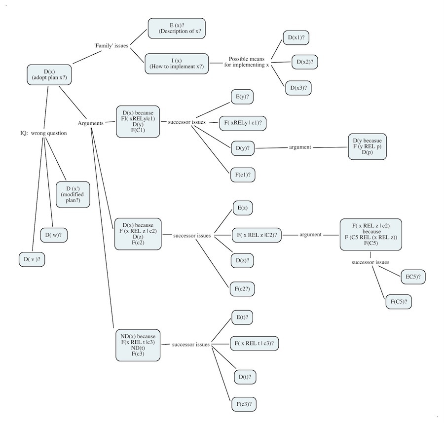 It is necessary to clarify that some claims of arguments — that are often part of argument pattern representations in popular textbooks — should NOT be included in the display of a single planning argument because they are really arguments about ‘successor issues’: issues arising from challenges to main argument premises. Even the widely accepted representation of arguments by Toulmin (The Uses of Argument, 1958) makes this mistake: his argument diagram