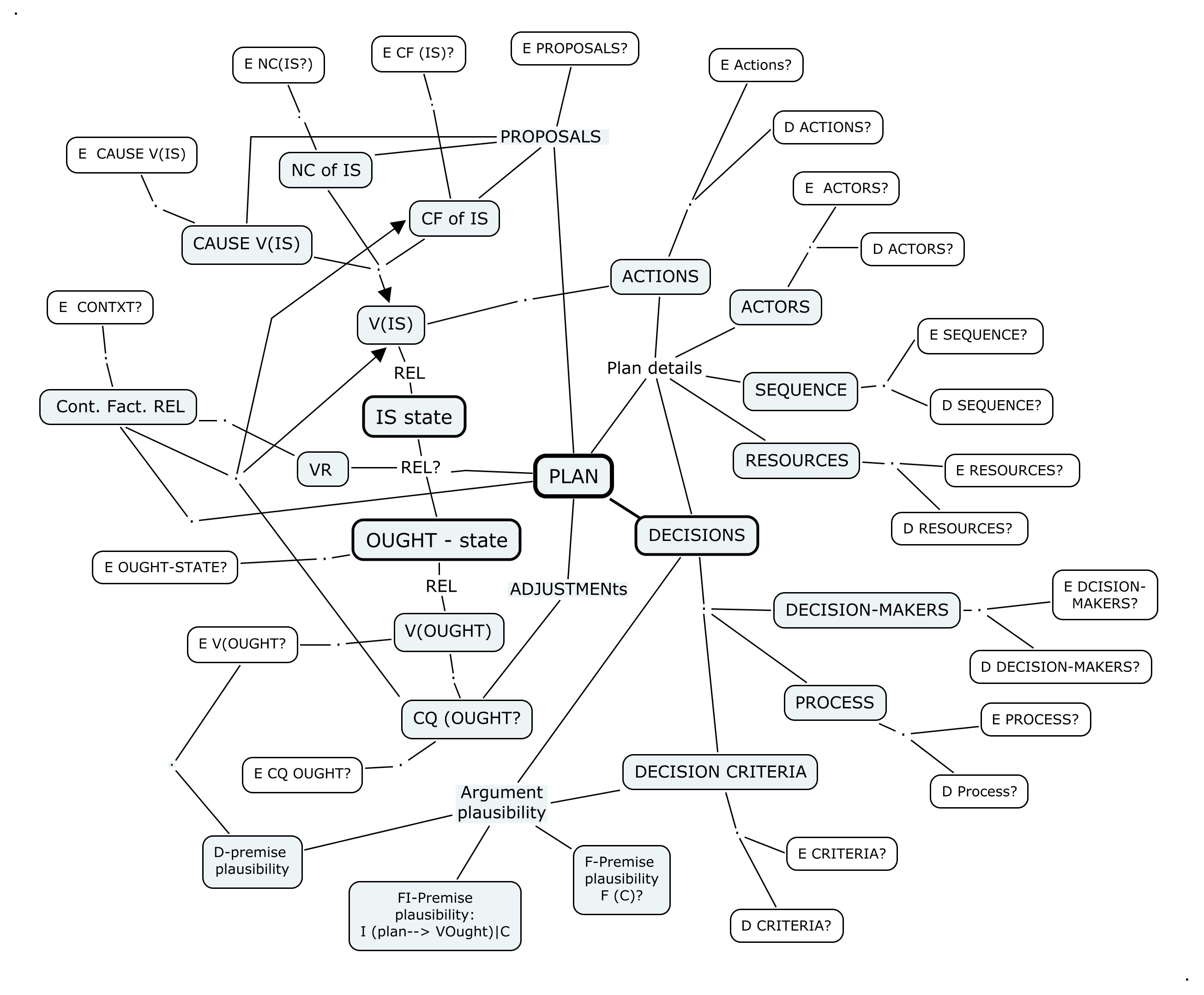 (Questions / issues will be italicized. The prefixes distinguish different question types: D for ‘deontic or ‘ought-questions; E for Explanatory questions, I for Instrumental of actual-instrumental questions, F for factual questions; the same notation can be applied to individual claims):