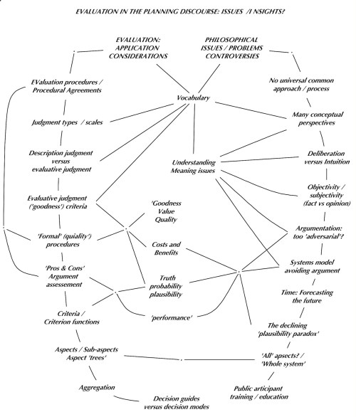 The map of critical issues in the diagram resulting from these insights had to be revised, showing the elements of evaluation on one side and the issues arising from different views about the role of evaluation in the planning process on the other.
