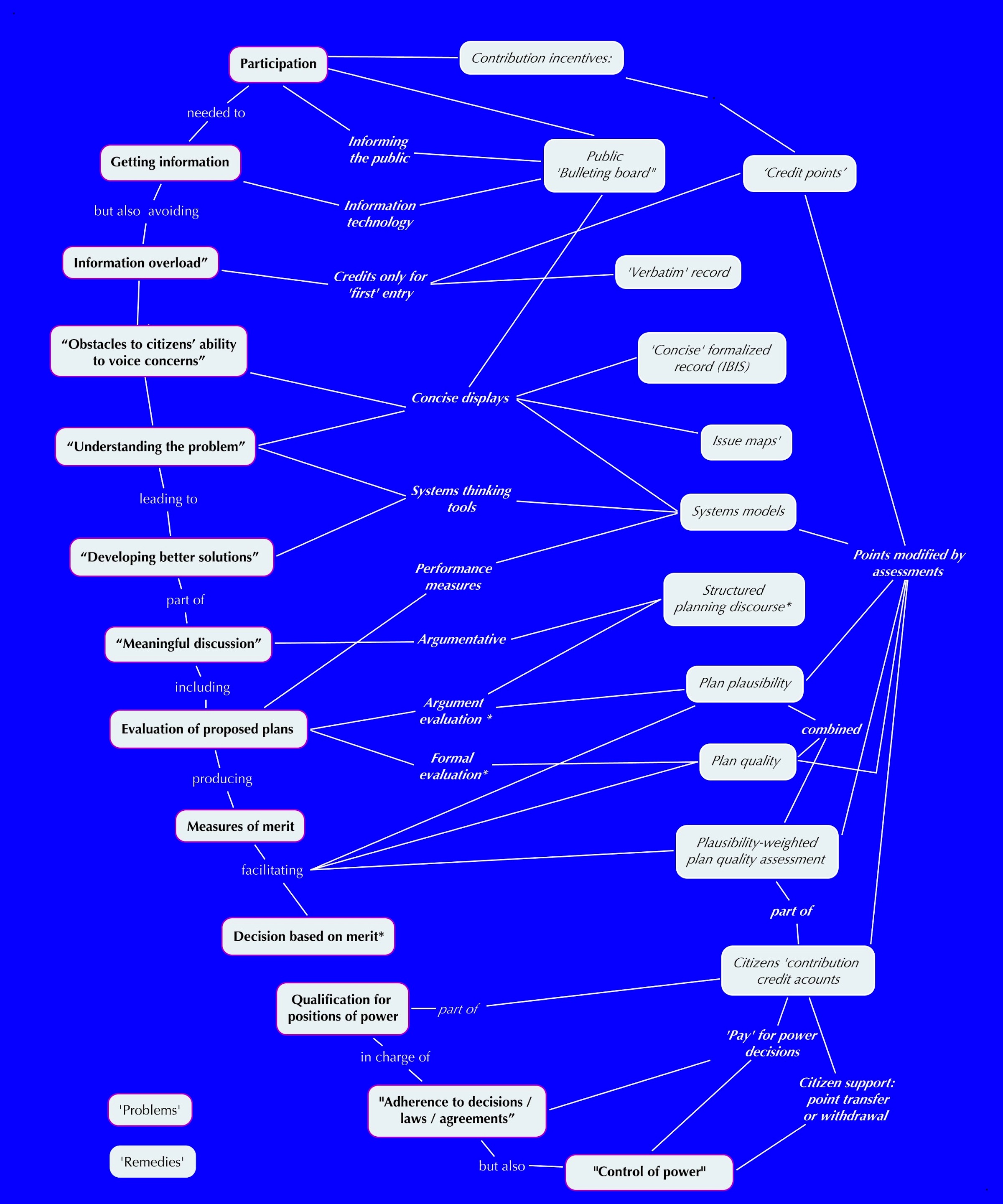 – Ah, I think I see what bothers you. It looks like something like restricting people’s ‘voting rights’ or ‘rights to free speech, does it? Yes. That impression would be bad, not necessarily justified. There must be a clear distinction between entering an information item, and making it ‘count’ in the decision. As long as decisions are made on the basis of vote counts, that impression is understandable, sure. But what we are after, is to reach decisions based on the merit of the information, not just on the number of votes — votes that may be un-informed , ill-informed, or deliberately ignoring the concerns of many other parties — the losing minority of the voting process. And to determine the merit of a piece of information or argument pro or con a plan, it only needs to the stated once. But now we have to deal with the issue of the method by which the merit of a piece of information can be determined.