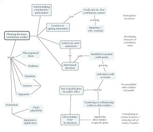 – Bravo! That is precisely it: those assessment scores are another way of saying how much someone’s comment providing those claims is worth, in that planning discussion. So if we now get some overall statistic of the whole group’s assessment scores of those contribution items, we are not only getting a measure of that item’s merit or weight towards the group’s plan decision, which is also a measure of that entry’s merit in the entire discourse. And the original ‘credit point’ acknowledgement can now be adjusted up or down according to those scores. If the scores as plausible, truthful, supported by evidence, and the ought-premise is important, the entry credit will shift from just ‘present’ upwards to a positive value, but if the claims are less credible, untrustworthy, the entry credit will become negative.