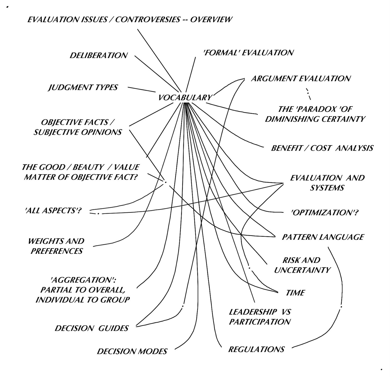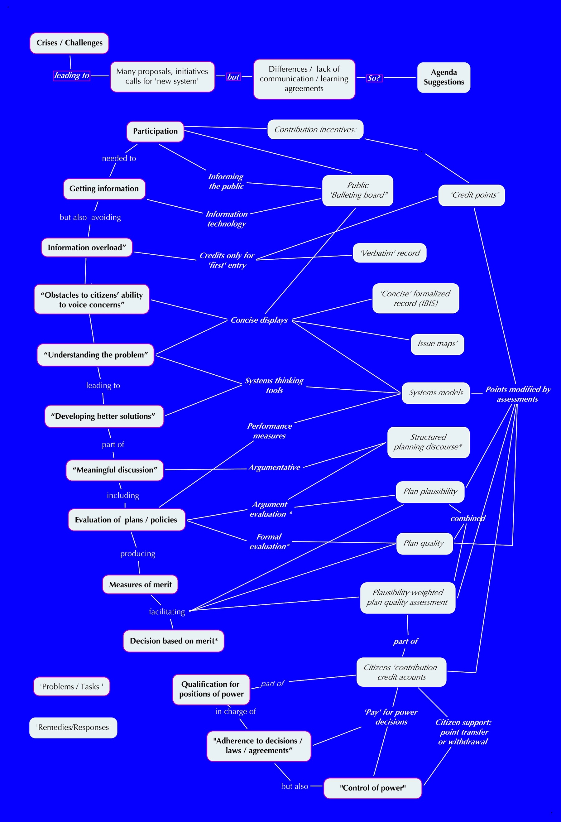 – Fine. Where were we? Okay. With a little help from our computers, we have calculated the overall judgment scores for the proposed plan, from all the personal scores of discourse participants. And along the way, the computer has stored and used all the judgment scores for the set of argument premises that the participants have made. So we can also calculate the group scores for each premise judgment, don’t you see? And that would be one way to express the value, the merit of that piece of information in the opinion of that group. So now the original contribution credit can be adjusted up or down according to that score.