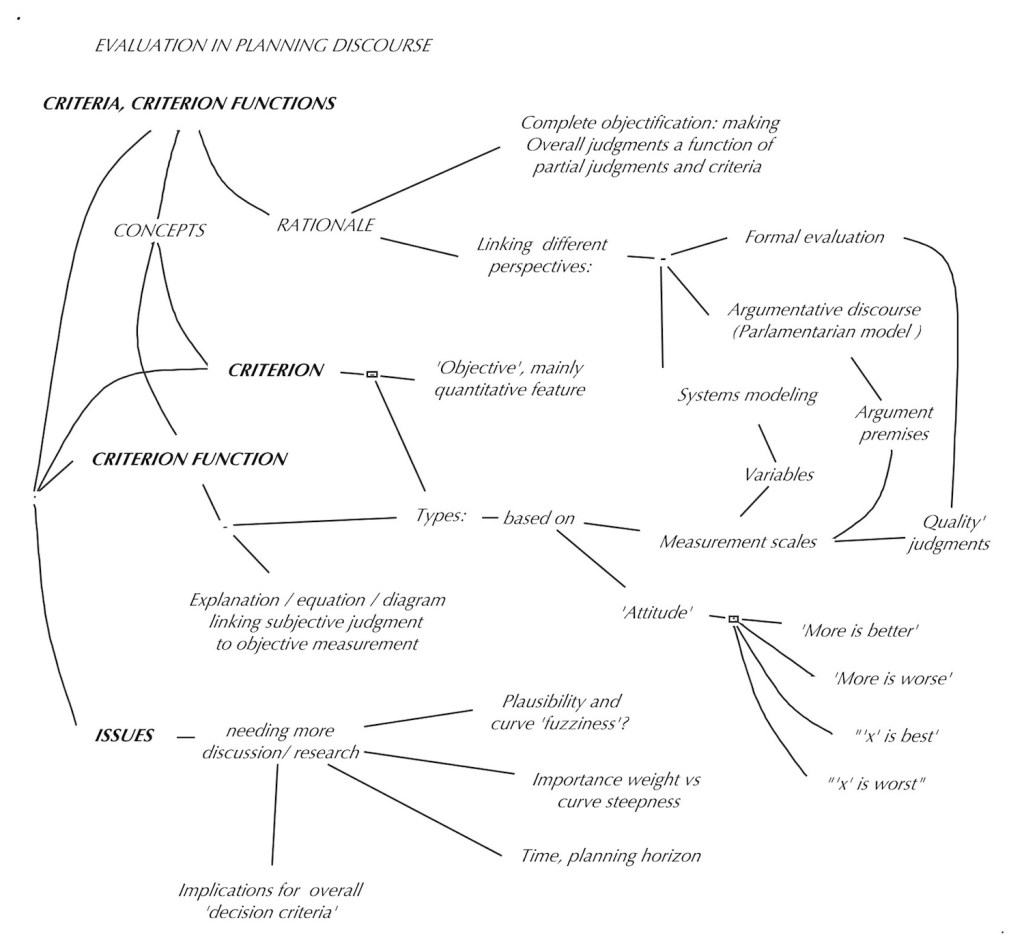 As far as I can see, the other (‘ought’) part of planning and policy-making work — both the development of a) better evaluation, (development of measures of the merit of planning discourse contributions leading to ‘solution merit’ criteria) and b) the development of better criteria for planning decisions, in the face of acknowledged disagreement about the merit of information contributed to the discourse are at best still in the embryonic state. Systems thinking appears to many (perhaps unfairly so) as suggesting that decisions should be based on the assessment of ‘facts’ data alone, ignoring the proper assessment of ‘ought’ claims and how they must be combined with the ‘facts- claims to support better decisions.