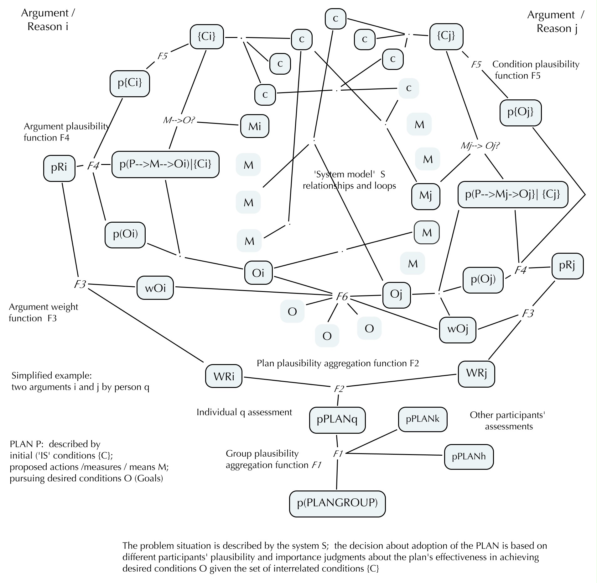 A key aspect of the integration effort is the insight that the ‘system’ will have to include all the features discussed in the discourse under the terms of ‘plan proposal’ with its details of initial conditions, proposed actions (what to do, by whom, using what tools and resources, and the conditions for their availability), the ‘problem’ a solution aims at remedying, which is described (at least) by specifying its current ‘IS’ state, the desired ‘OUGHT’ state or planning outcome, the means by which the transition of is- to ought-state can be achieved; and the potential consequences of implementing the plan, including possible ‘unexpected’ side-and-after-effects. Conversely, the assessment of arguments (the “careful weighing of pros and cons”) will have to explicitly address the system model elements and their interactions – elements that should be (but mostly are not) specified in the argument as ‘conditions under which the plan or one of its features is assumed to effectively achieve the specific outcome or goal referenced by the argument.